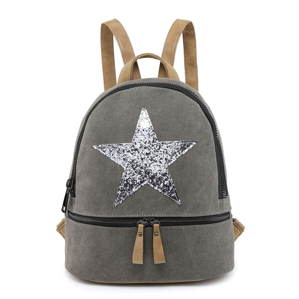 Medium sized fabric backpack with silver star embellishment. Single zip openings and small external zip pocket on the back. Internal zip pocket and two open pockets inside.